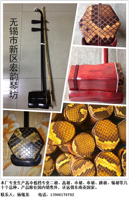 無錫市新區宏韻琴坊專業生產高中低檔專業二胡、高胡、中胡、申胡、越胡、錫胡等幾十個品種。本廠的產品除在國內銷售外,還遠銷東南亞國家。