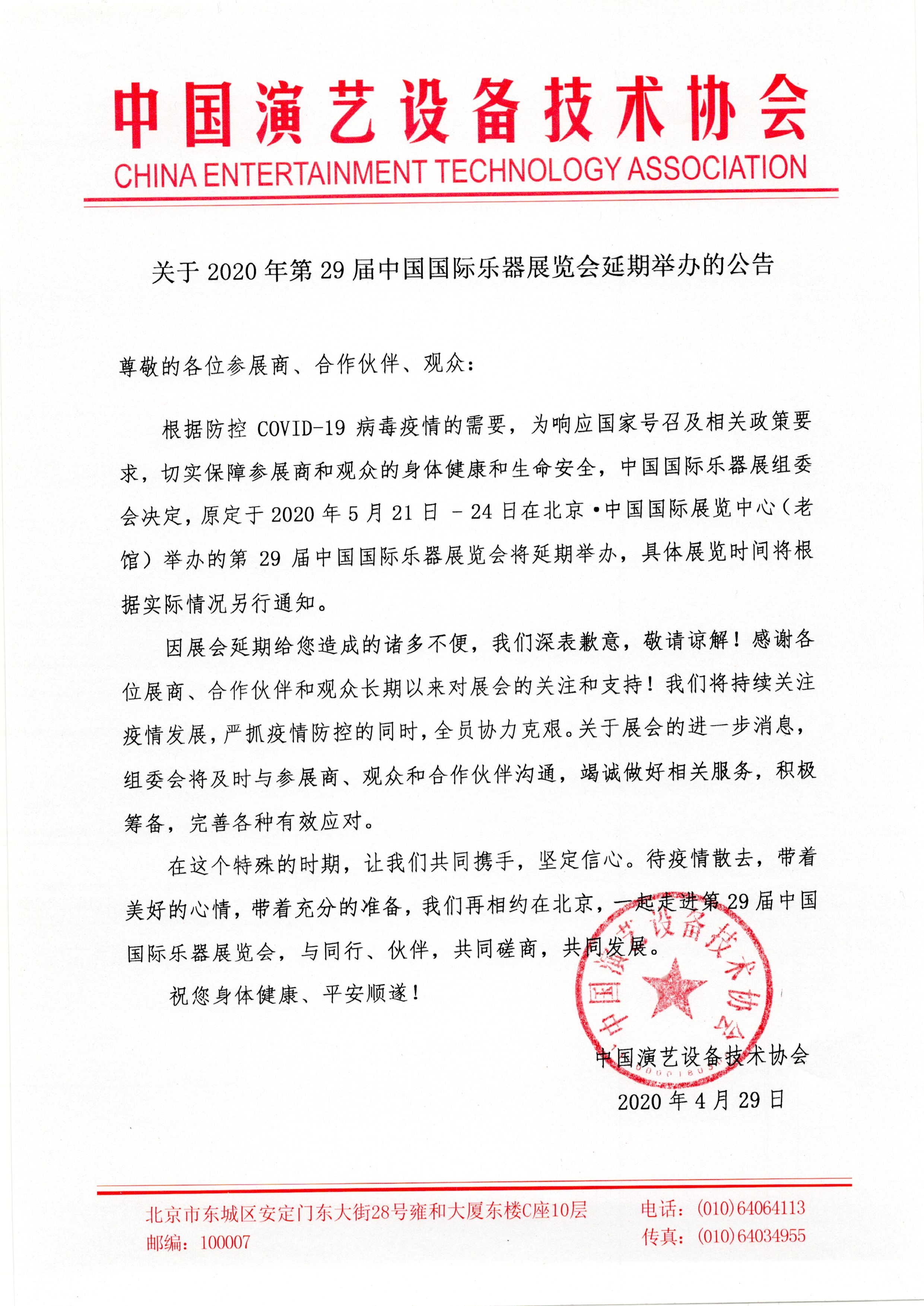 關于2020年第29屆中國國際樂器展覽會延期舉辦的公告