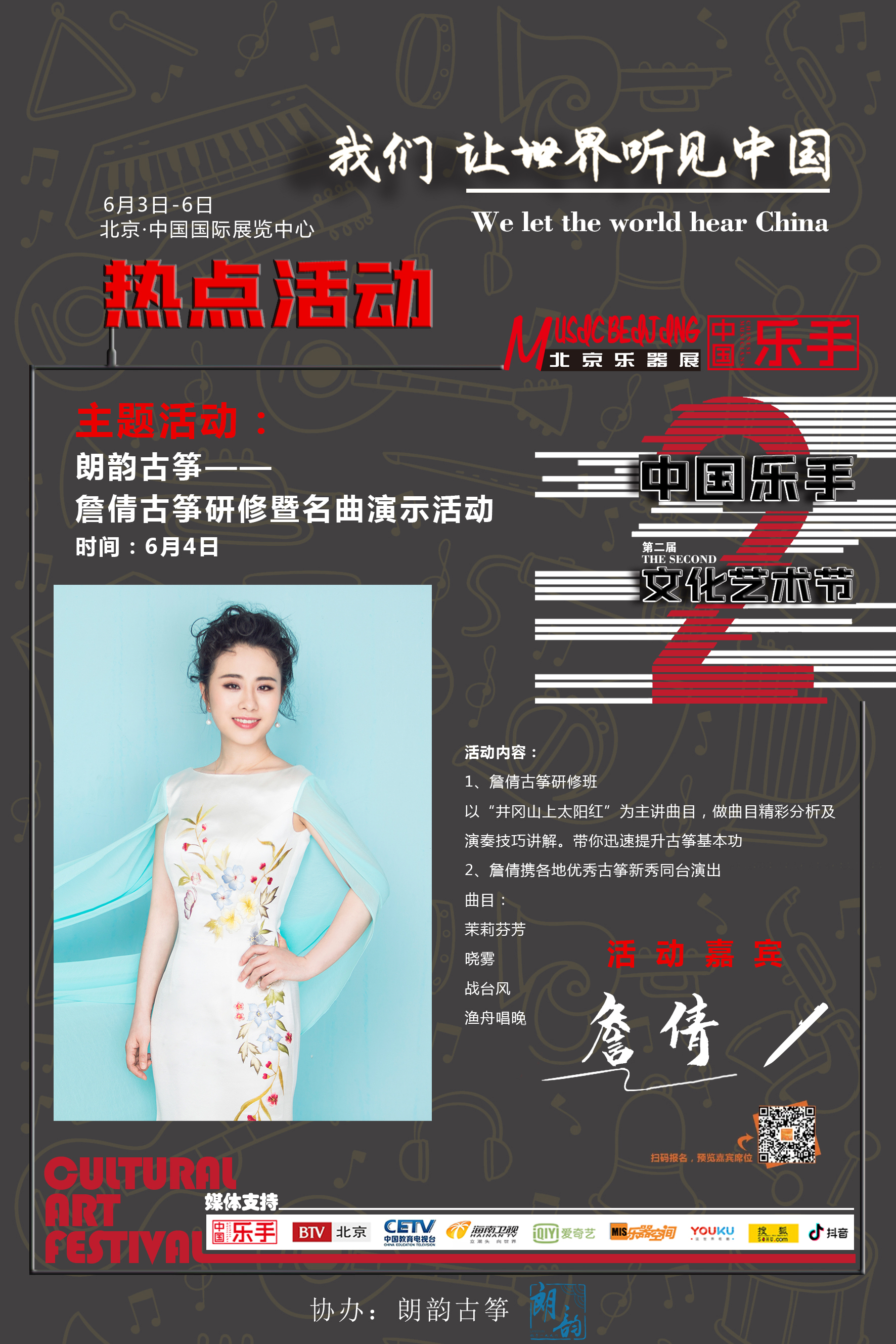 北京國(guó)際樂(lè)器展重要活動(dòng)——中國(guó)樂(lè)手文化藝術(shù)節(jié),將與展會(huì)同期舉辦,(6月3日—6日),今天小編為大家?guī)?lái)6月4日,青年古箏演奏家詹倩老師的活動(dòng)專場(chǎng)
